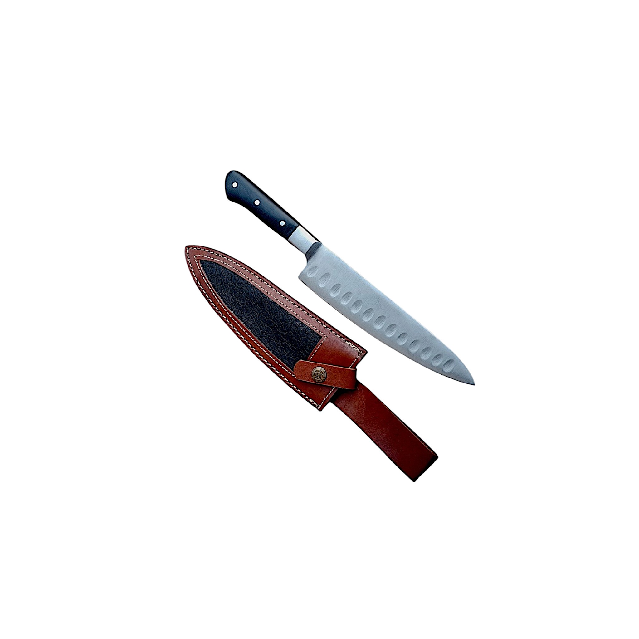 Elevate your culinary skills with this versatile professional chef’s knife, an essential tool for every kitchen. Its razor-sharp stainless steel blade features a Granton edge (the dimples), designed to prevent food from sticking, ensuring smooth, effortless slicing and dicing. The ergonomic black handle provides a comfortable and secure grip for superior control. Complete with a durable, custom-fit leather sheath for safe storage and transport, this high-performance kitchen knife is perfect for home cooks, culinary students, and professional chefs seeking reliability and precision.